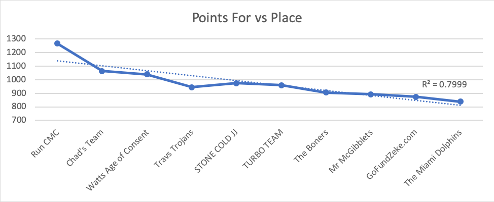 Additionally, while Trav may be sitting in 4th place, he may be due for regression. Shown in Figure 3 are total Points For for each team compared to their relative position in the league.