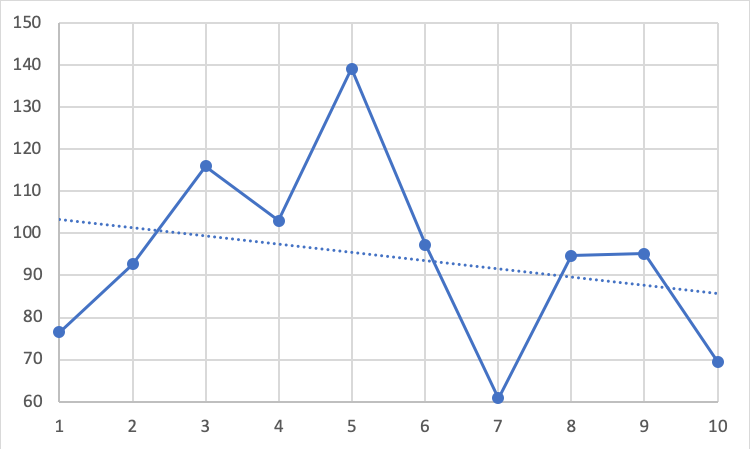 What we see here is that Points For correlates to Position with a R2 value of 0.8. We have one exception to this trend in the Trojans. Both Matt and JJ possess more Points For but 1 and 2 fewer wins respectively. My prediction is that Trav is due for a regression. Shown in Figure 4 are Trav’s Points per week along with a trend line. Very concerning for the Trogans.
